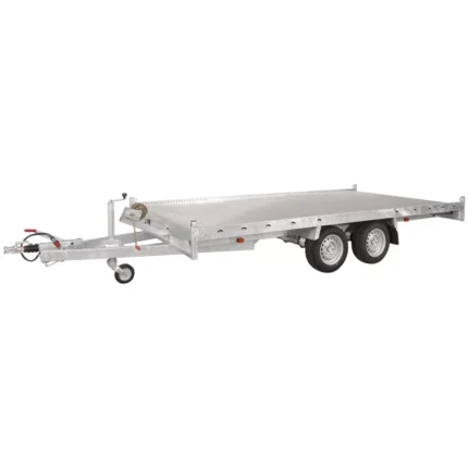 Die Multitransporterwanne ist das ideale Produkt für den Transport langer Fahrzeuge wie SUVs oder Transporter. Der Boden ist gewölbt; Es ist mit 3000 oder 3500 kg in 2 oder 3 Achsen erhältlich. Das Chassis ist robust und der Boden besteht aus Aluminium. Es besteht aus 250 cm langen Rampengehäusen und Handläufen aus Stahl. Die Beleuchtung ist Voll-LED