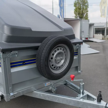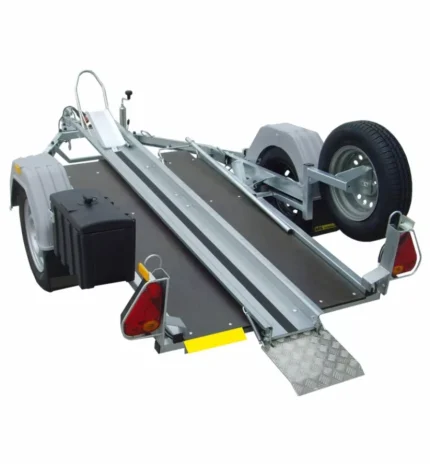 Der Motorradträger KXL 175 ist serienmäßig mit einer Vorderradsperre zum Umschnallen ohne Krücke ausgestattet! Sein Chassis ist schwarz lackiert, seine Kotflügel sind aus Metall und seine Felgen sind aus Design-Aluminium.