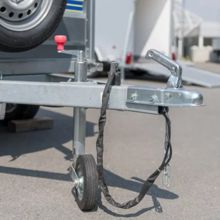 Der Motorradträger KXL 175 ist serienmäßig mit einer Vorderradsperre zum Umschnallen ohne Krücke ausgestattet! Sein Chassis ist schwarz lackiert, seine Kotflügel sind aus Metall und seine Felgen sind aus schwarzem Aluminium.