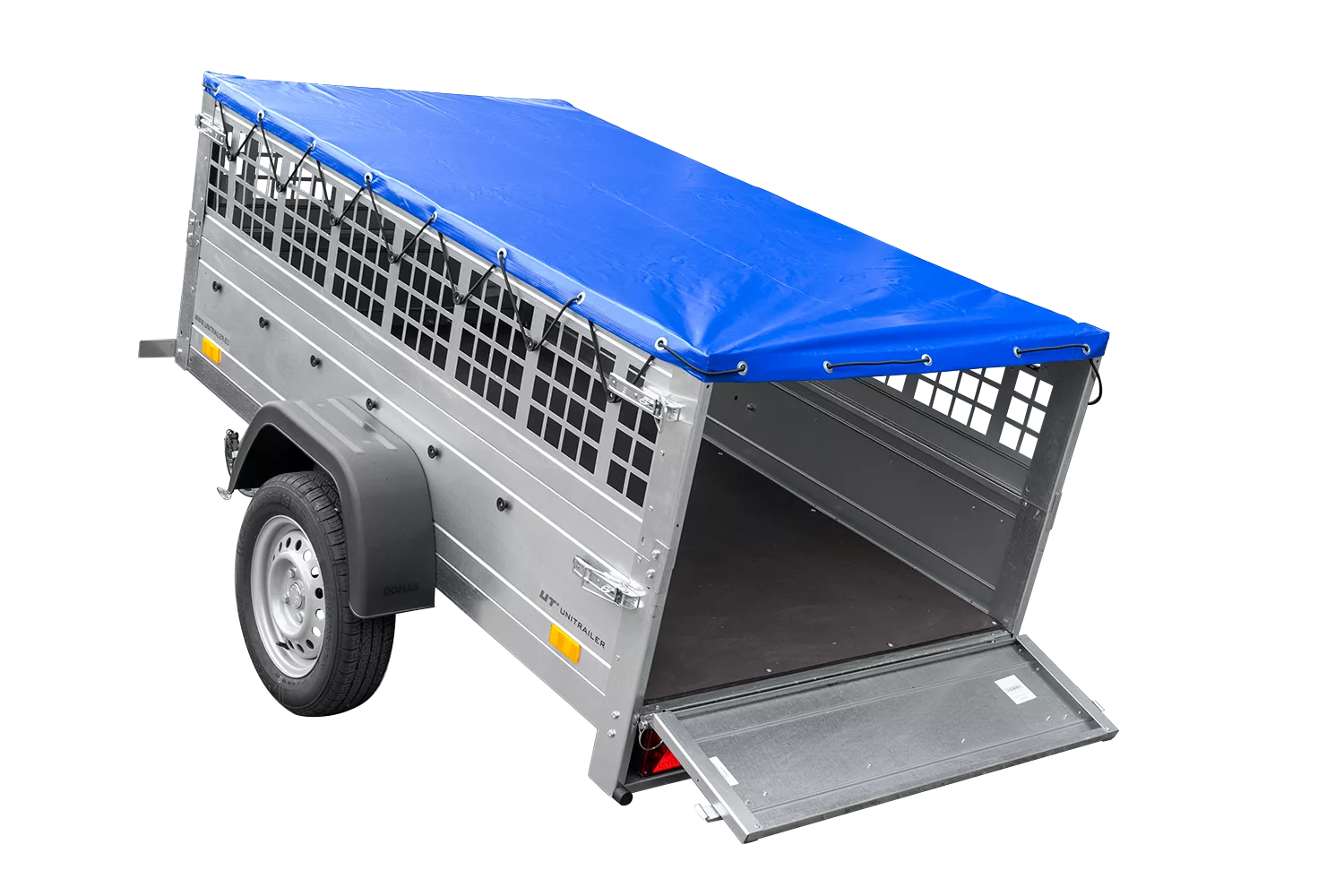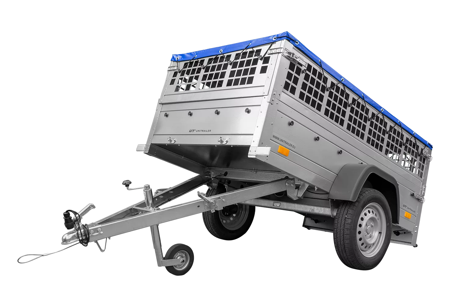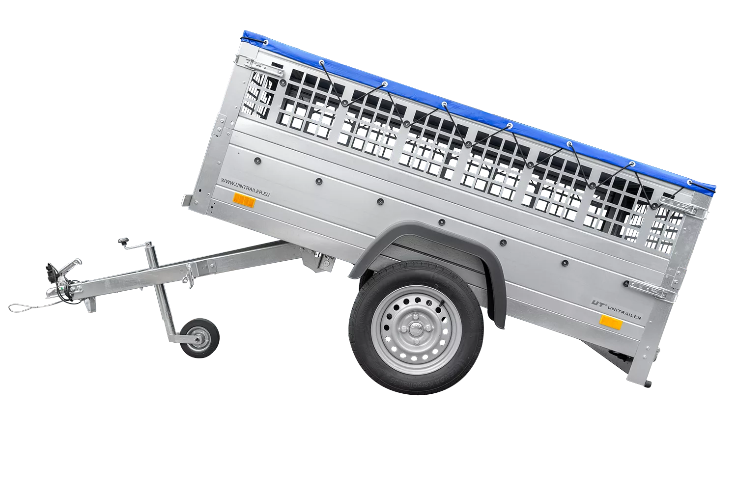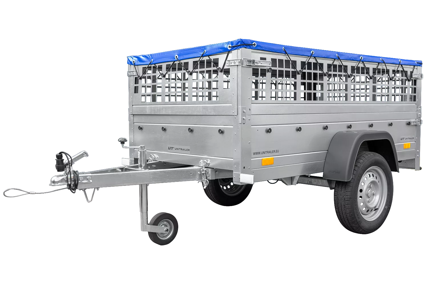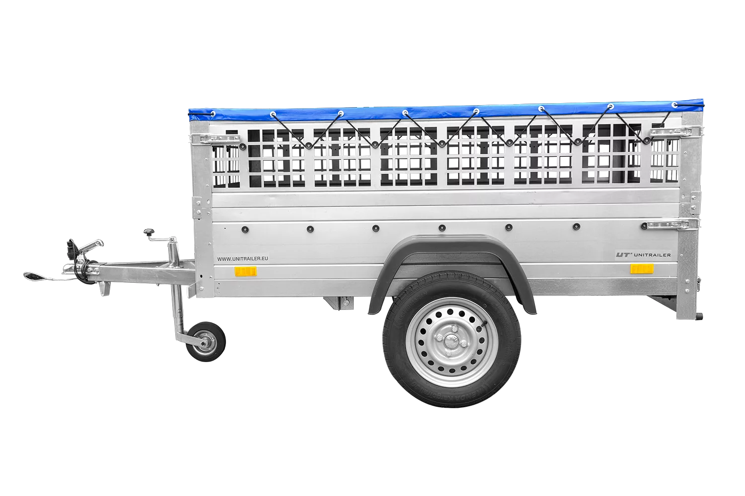 200×106 Mesh-Anhänger mit blauer Flachplane, Mesh-Seiten und Stützrad – Gartenanhänger 200 KIPP