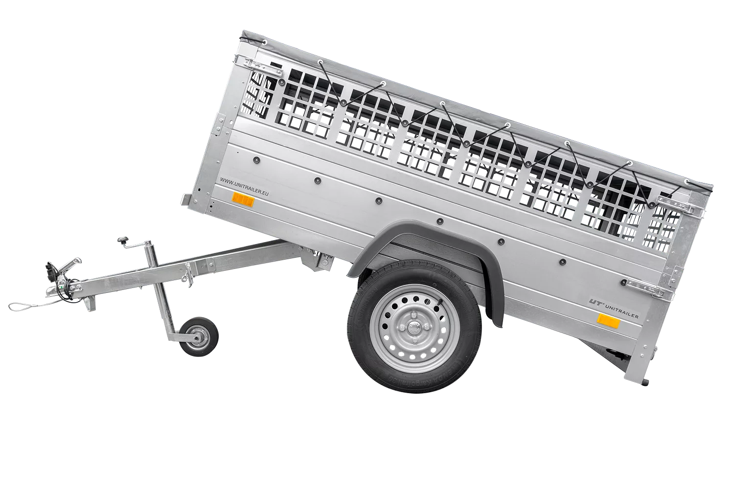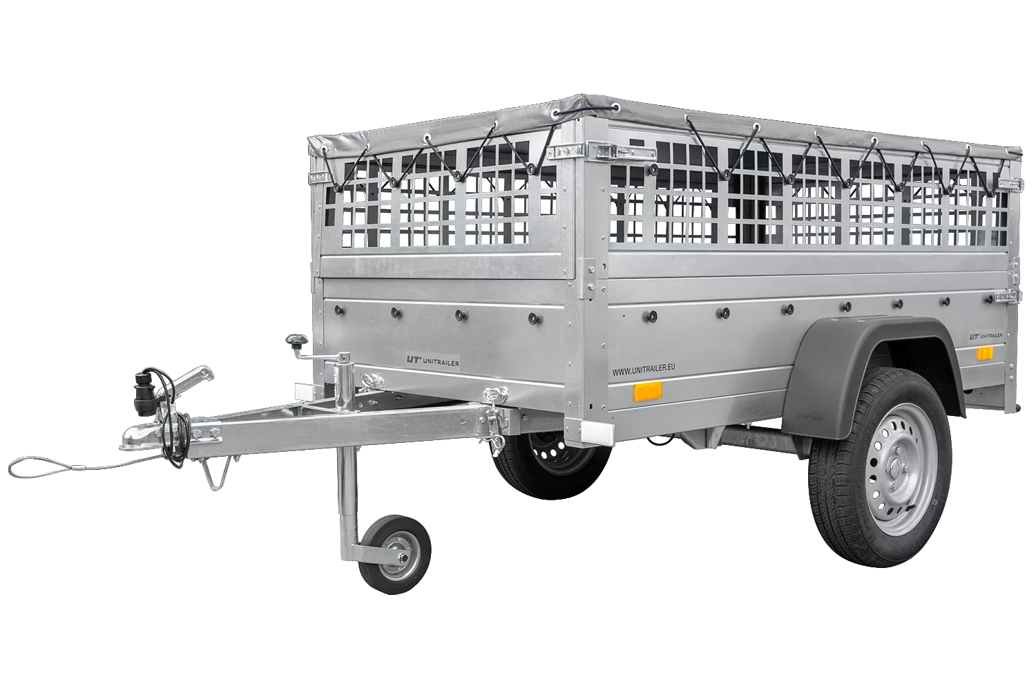 200×106 Mesh-Anhänger mit grauer Flachplane, Mesh-Seiten und Stützrad – Gartenanhänger 200 KIPP