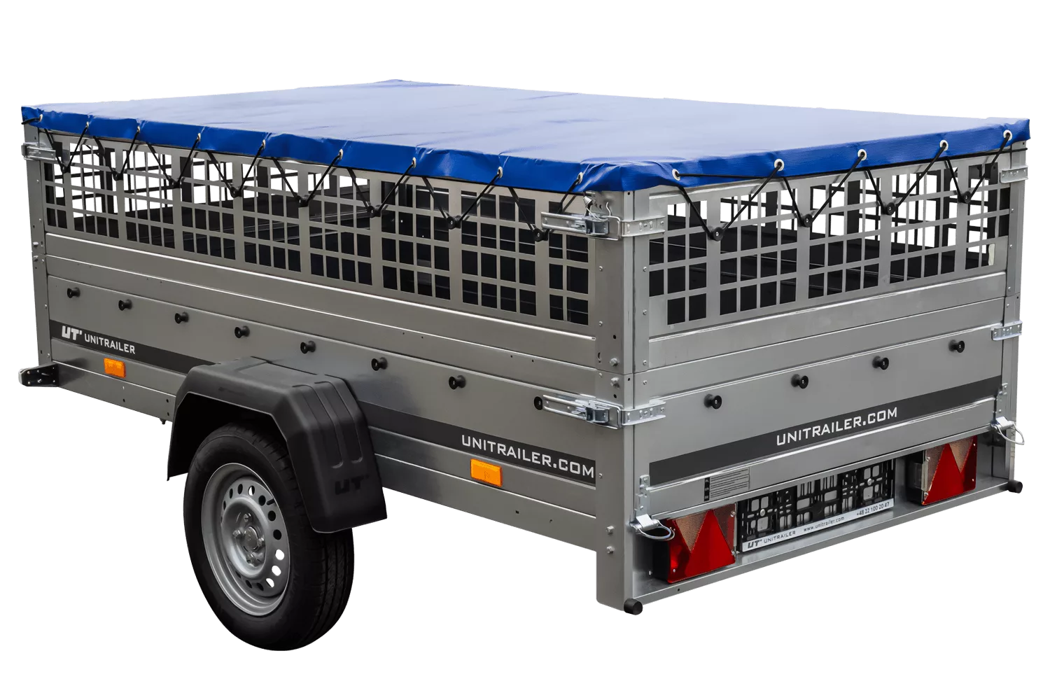 Anhänger ohne Bremse 230×125 mit flacher blauer Plane, Netzseiten und Stützrad – Gartenanhänger 230 KIPP