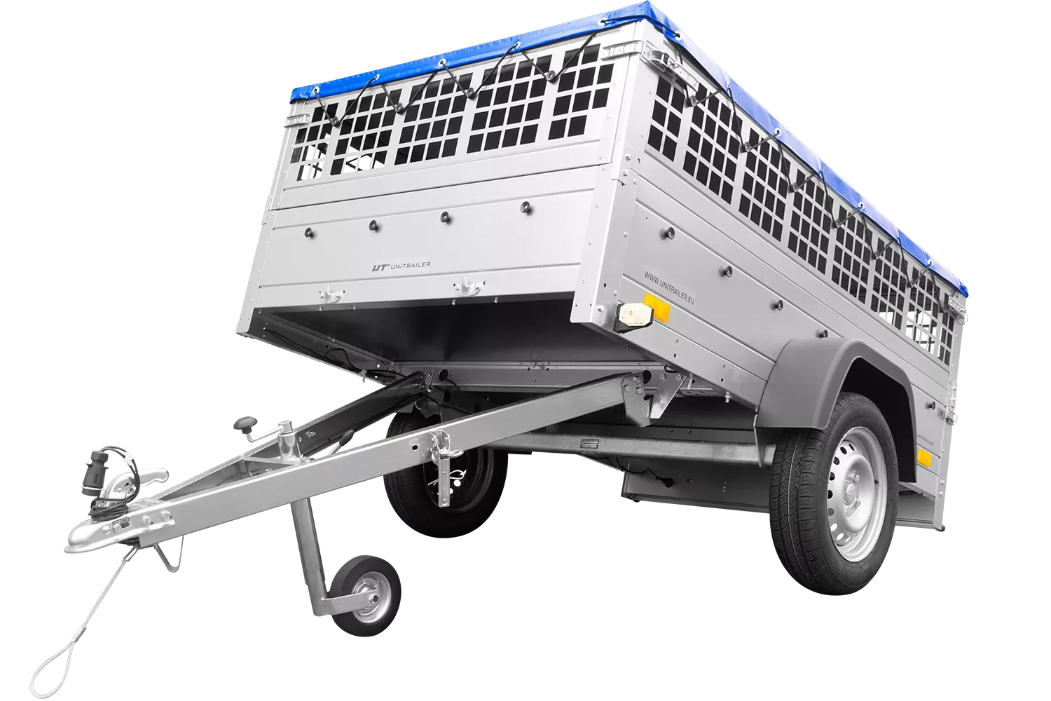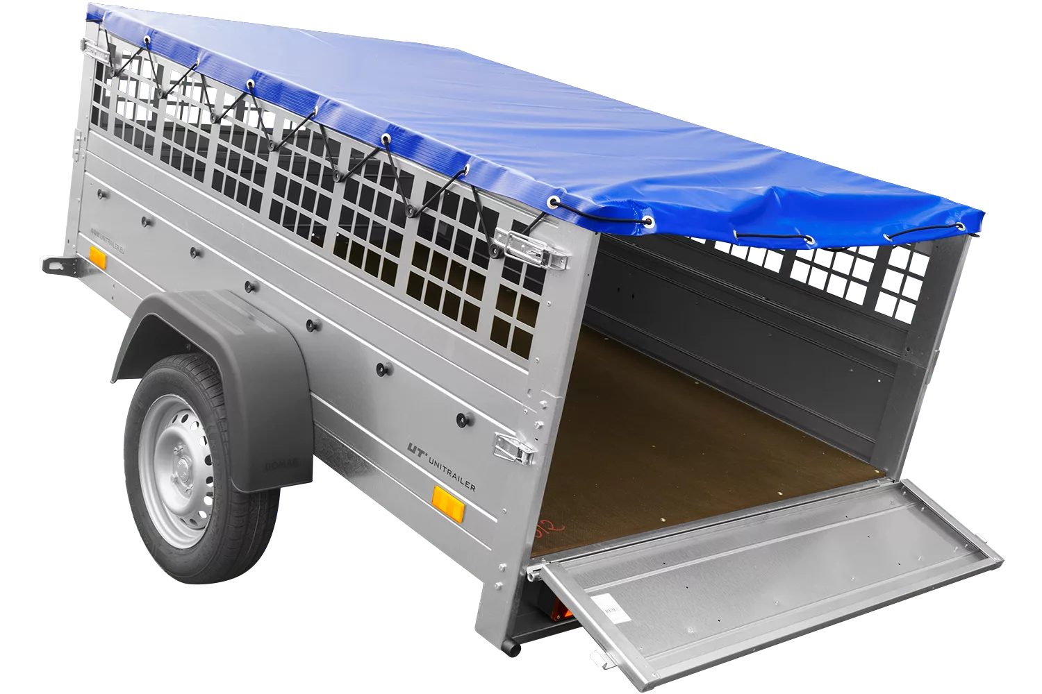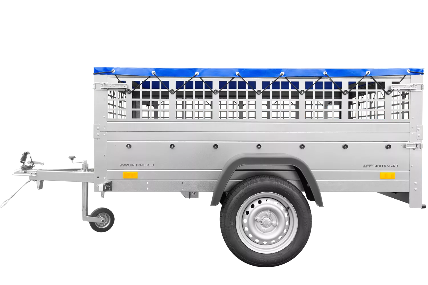 Einachsanhänger 200×125 mit flacher Plane, Planenstützstangen, Gitterwänden und Stützrad – Gartenanhänger 201 KIPP