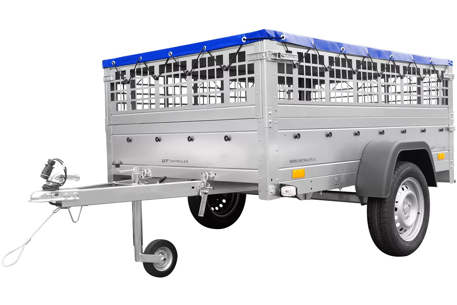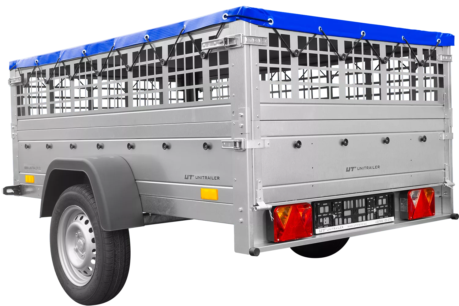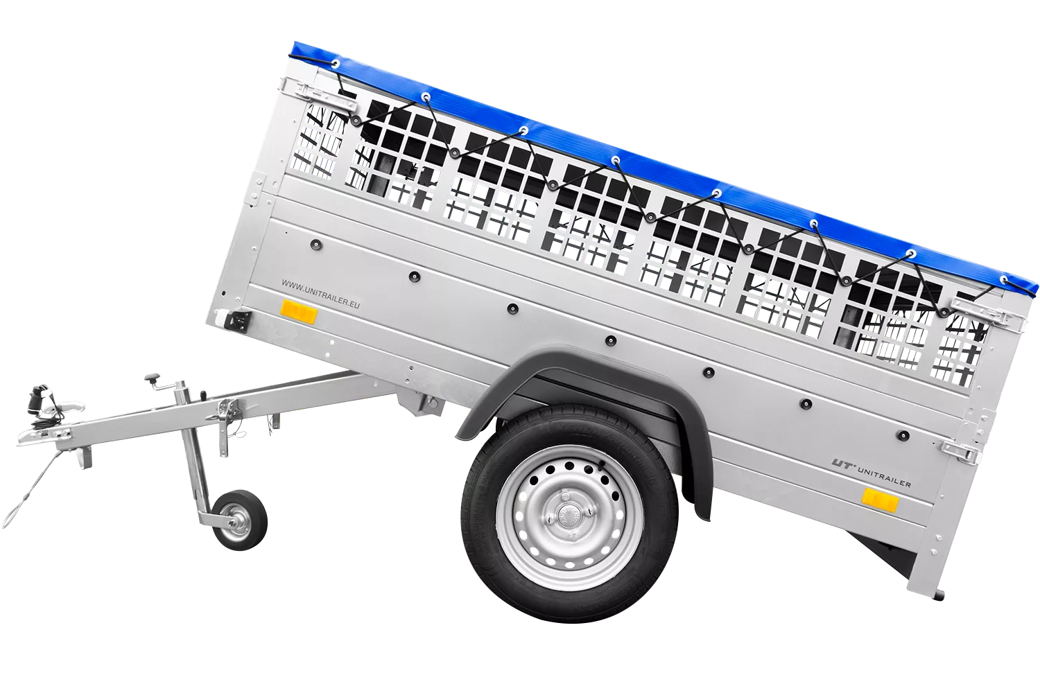 Einachsanhänger 200×125 mit flacher Plane, Planenstützstangen, Gitterwänden und Stützrad – Gartenanhänger 201 KIPP