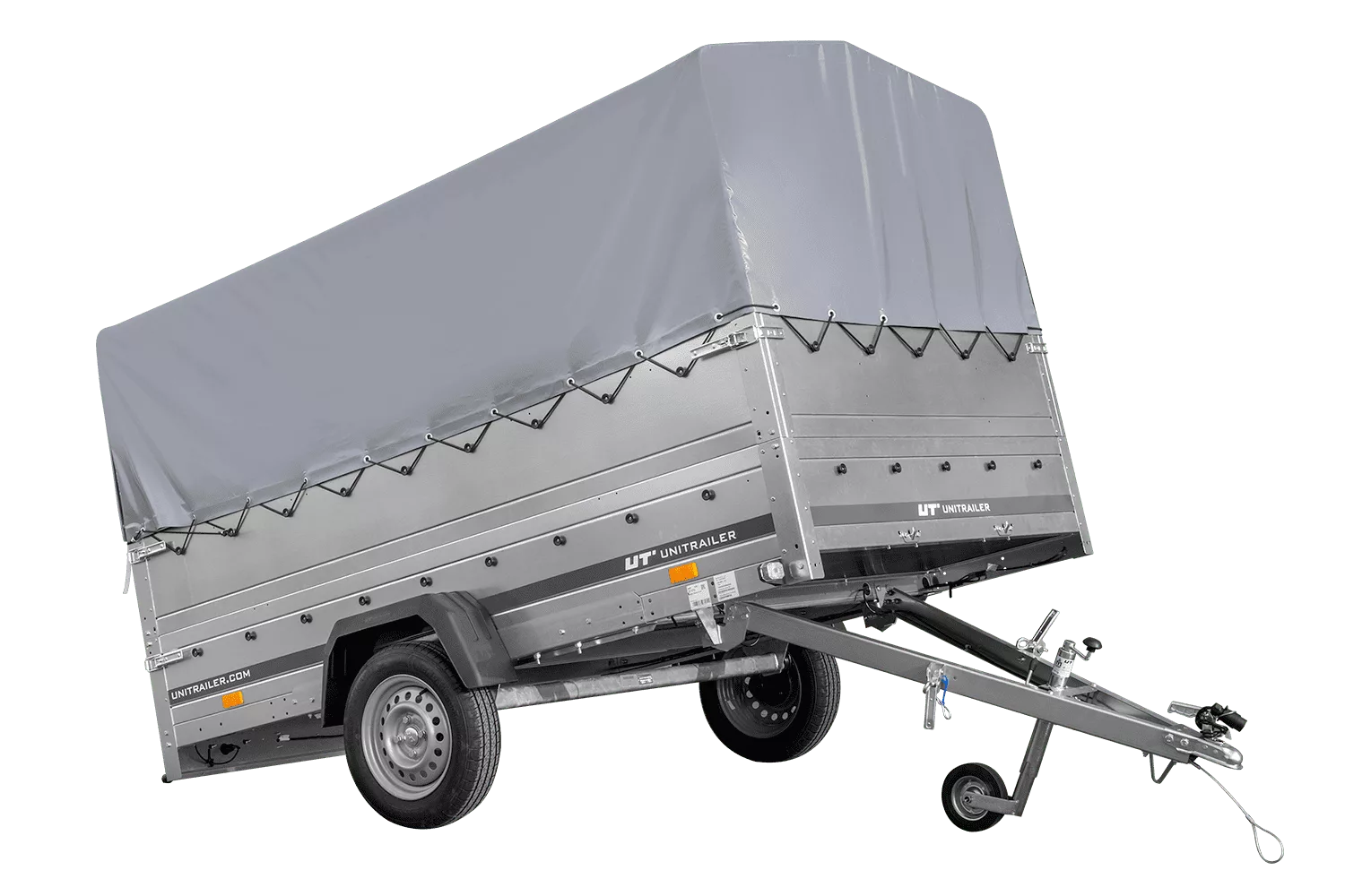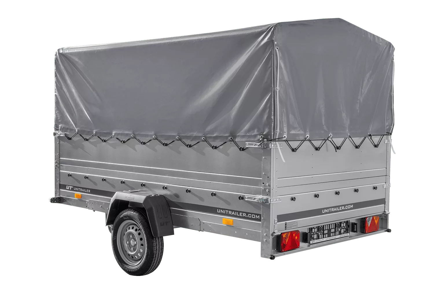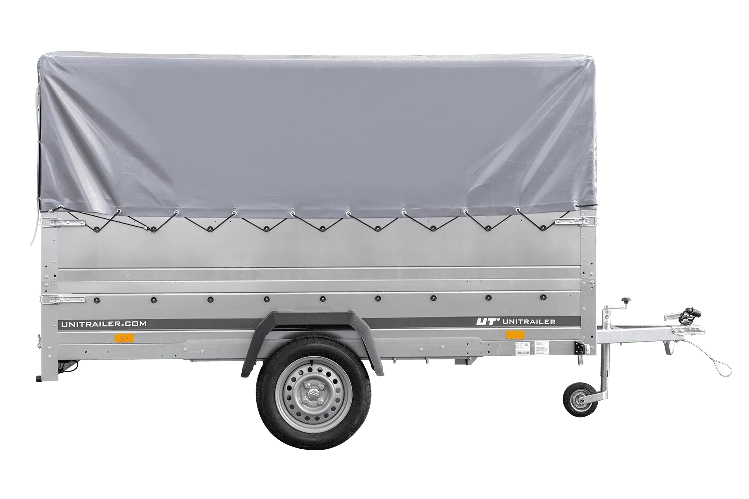 Einachsanhänger 264×150 UNITRAILER GARDEN 265 KIPP mit zusätzlichen Bordwänden, H-800-Reifen und grauer Plane