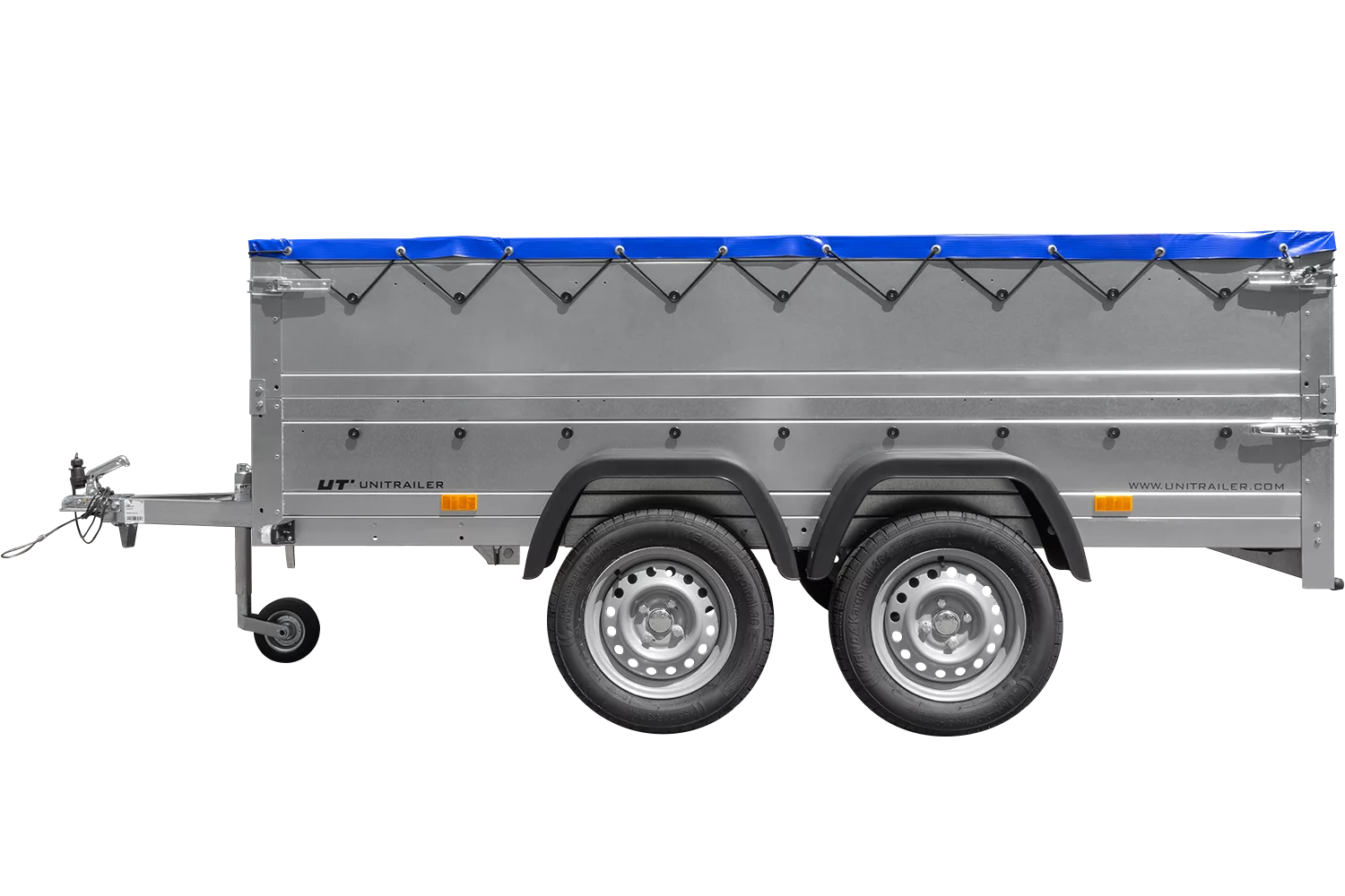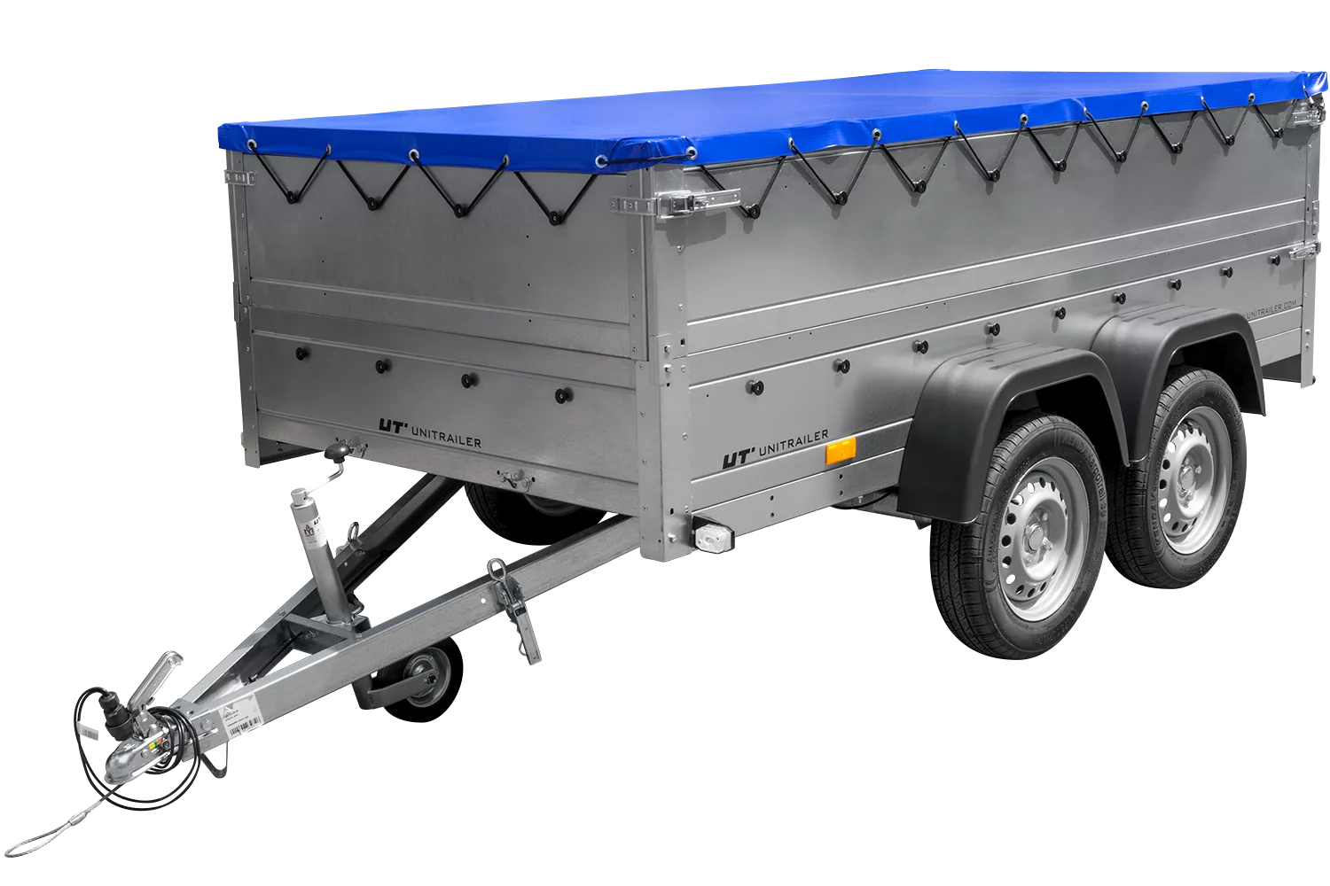 Gartenanhänger 264/2 KIPP-Doppelachsanhänger mit Stützrad, Bordwandaufsätzen und blauer Flachplane