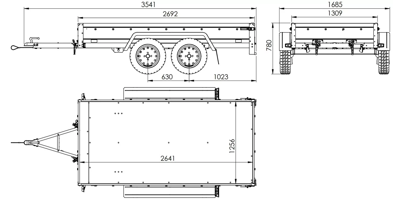 Breite der Ladefläche 1256 mm Länge des Laderaums 2641 mm zulässiges Gesamtgewicht max. 750 kg Modell Gartenanhänger 264/2 Kipp