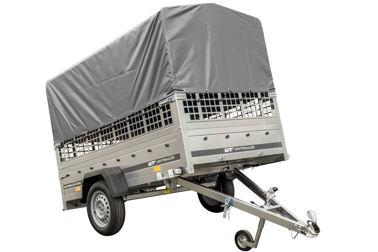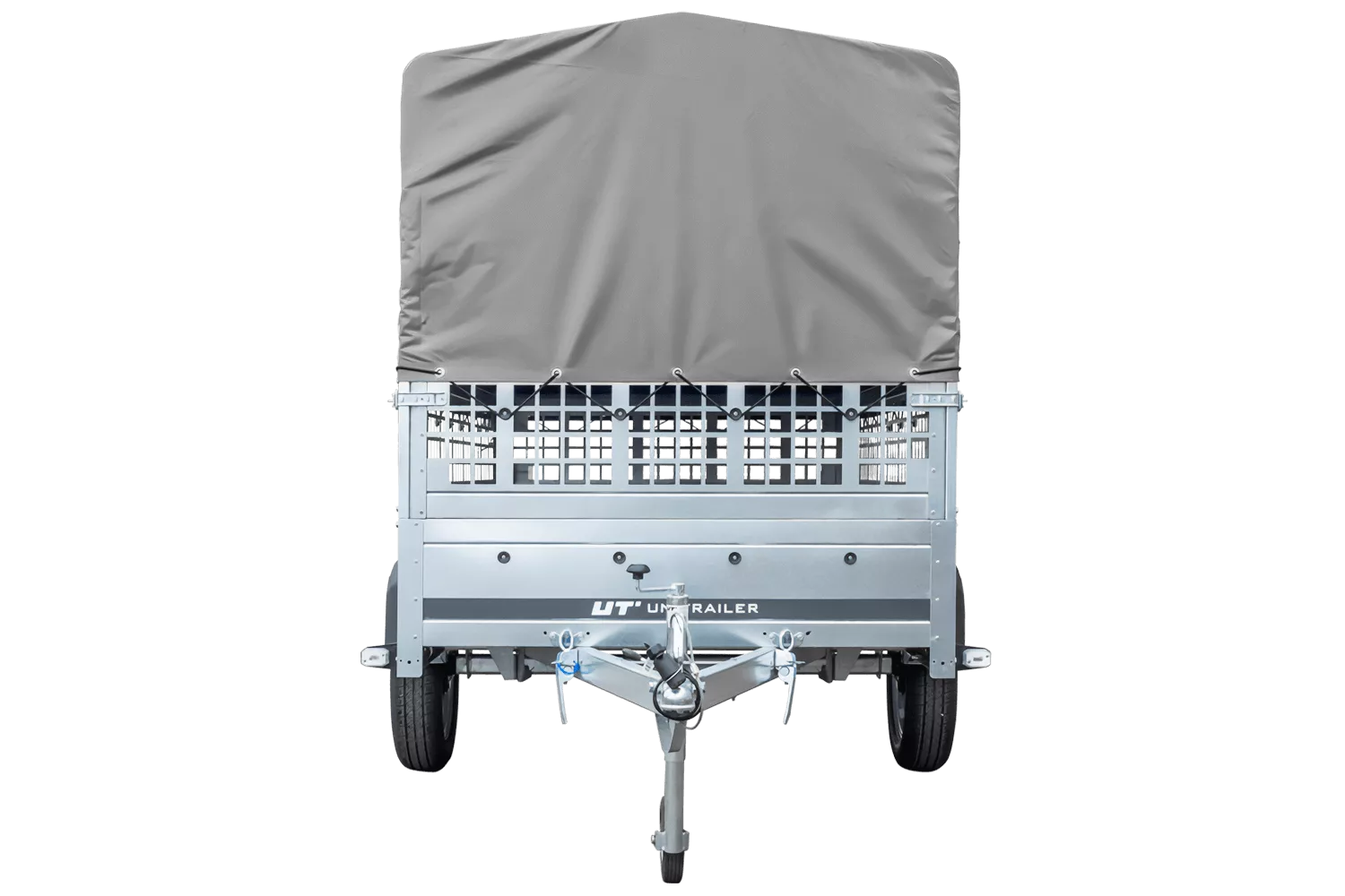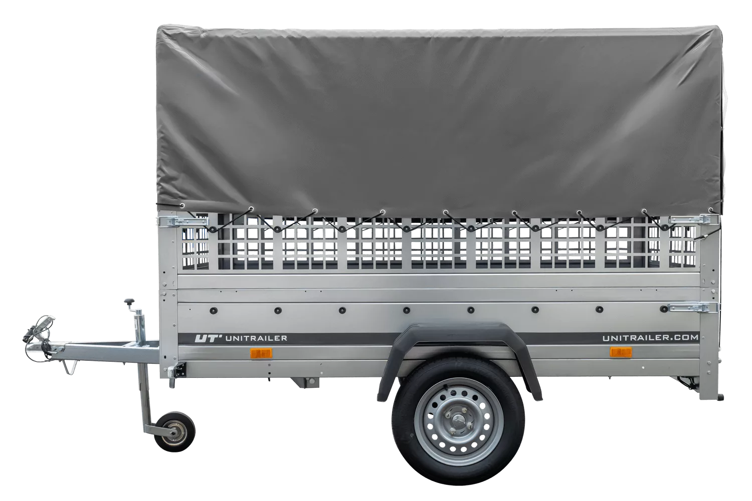 Großer 230×125 Anhänger mit hoher grauer Plane, Netzseiten und Stützrad – Gartenanhänger 230 KIPP