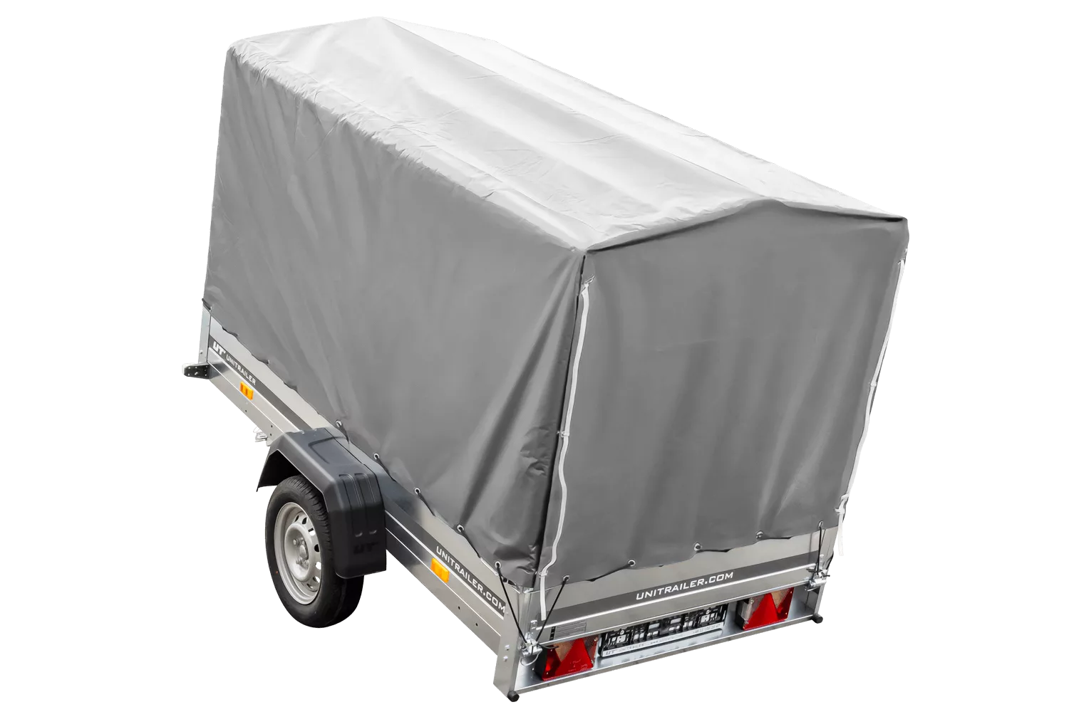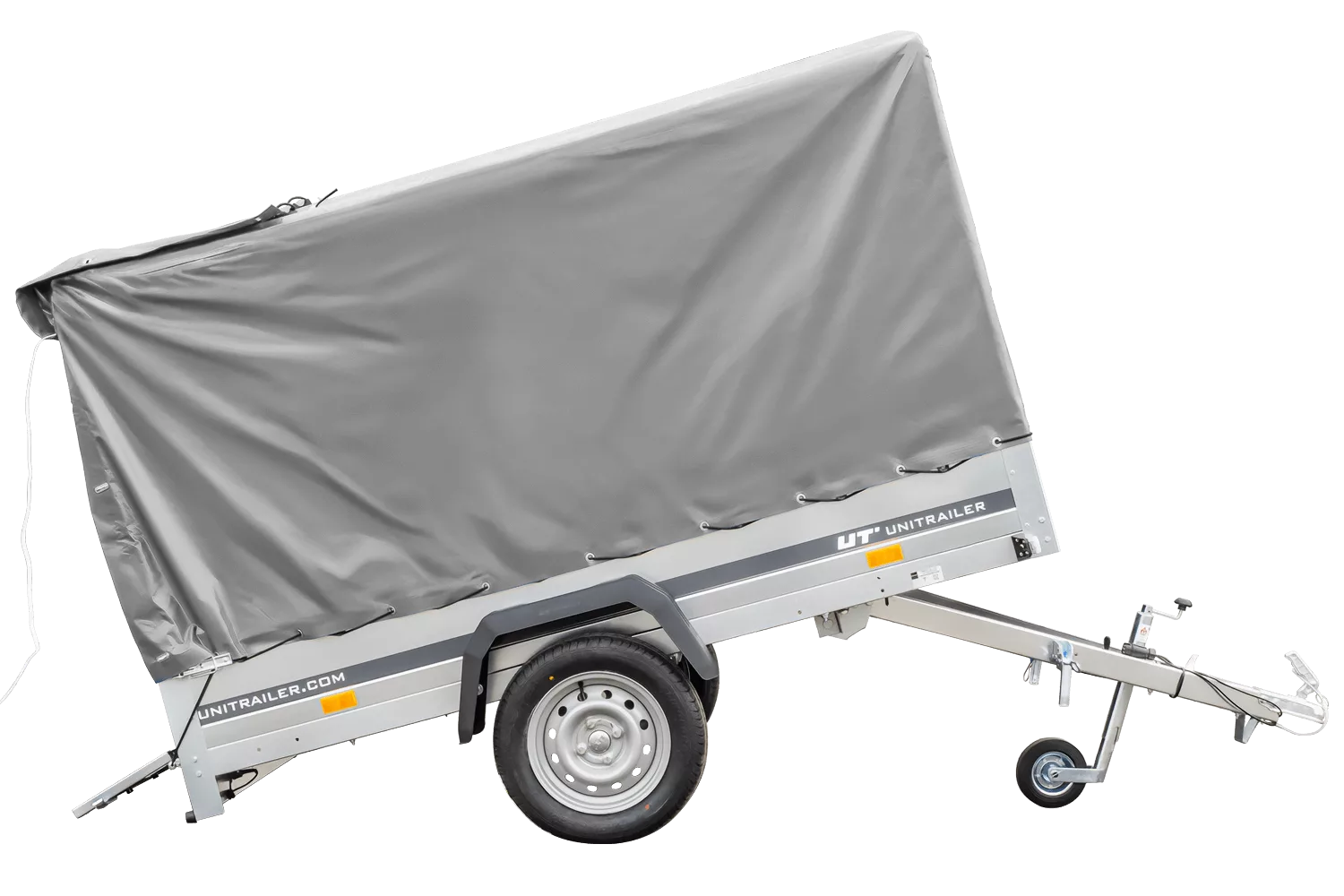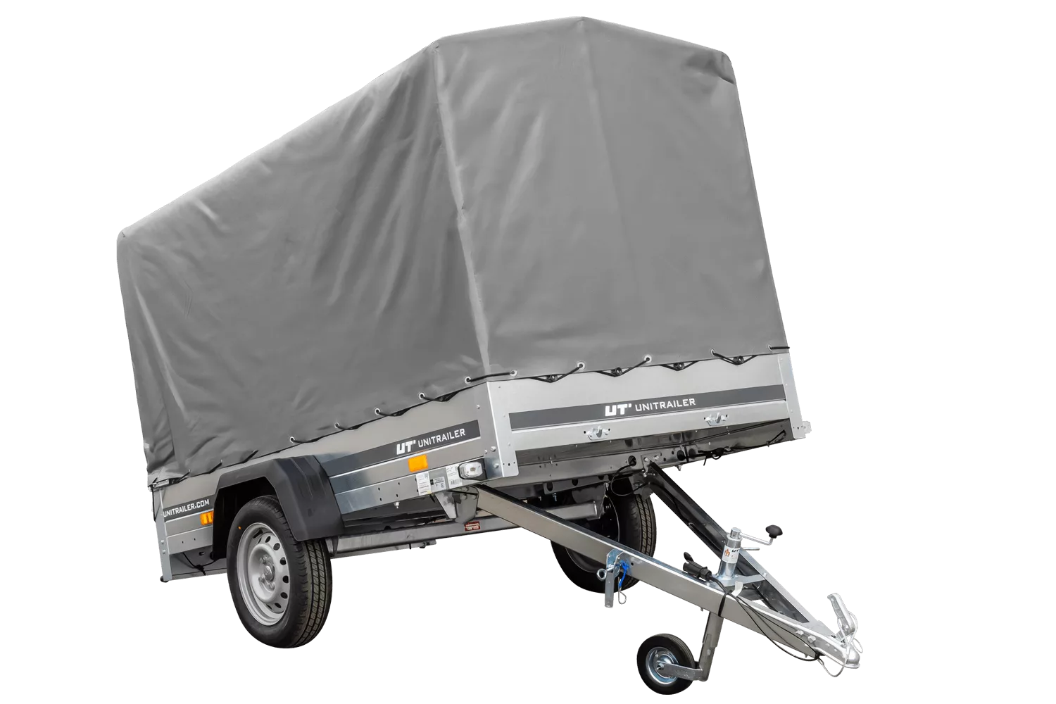 Straßenanhänger mit hoher Plane (110 cm), Reif (110 cm) und Stützrad 230×125 Gartenanhänger 230 KIPP