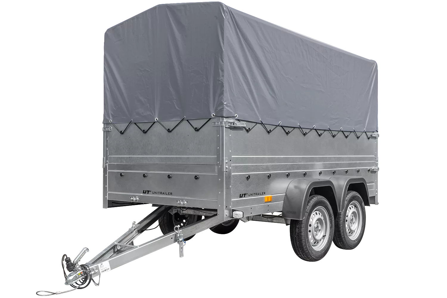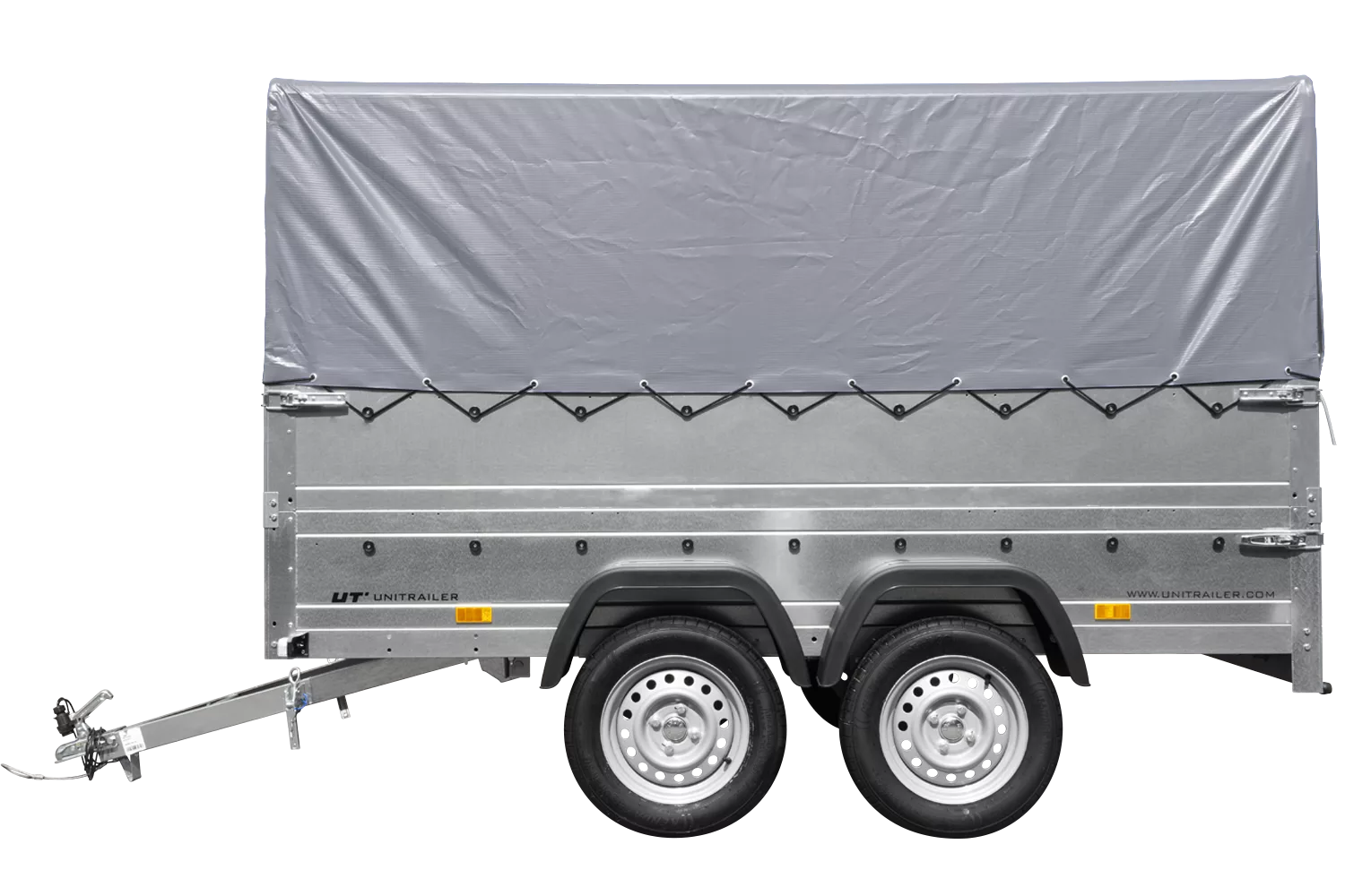 UNITRAILER GARDEN TRAILER 264/2 KIPP 2-Achs-PKW-Anhänger mit Stützrad, zusätzlichen Bordwänden, H-800-Fahrgestell und grauer Plane